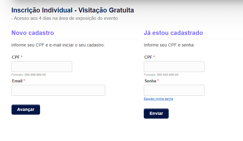 Nesta página, clique em “visitar a feira – gratuito”, então preencha seu cpf e e-mail e clique em “Avançar”.