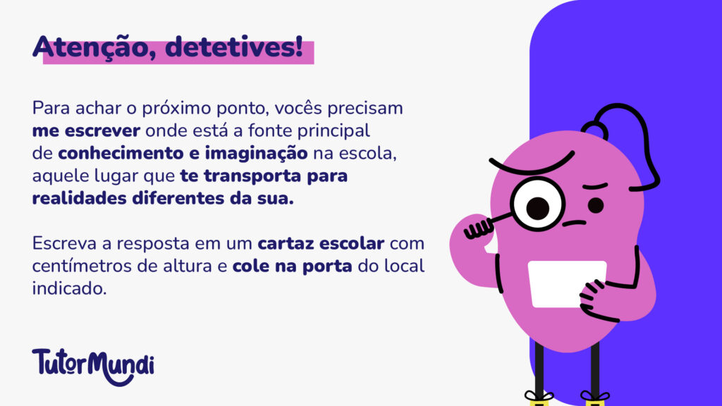 “Atenção, detetives! Para achar o próximo ponto, vocês precisam me escrever onde está a fonte principal de conhecimento e imaginação na escola, aquele lugar que te transporta para realidades diferentes da sua. Escreva a resposta em um cartaz escolar com centímetros de altura e cole na porta do local indicado.”